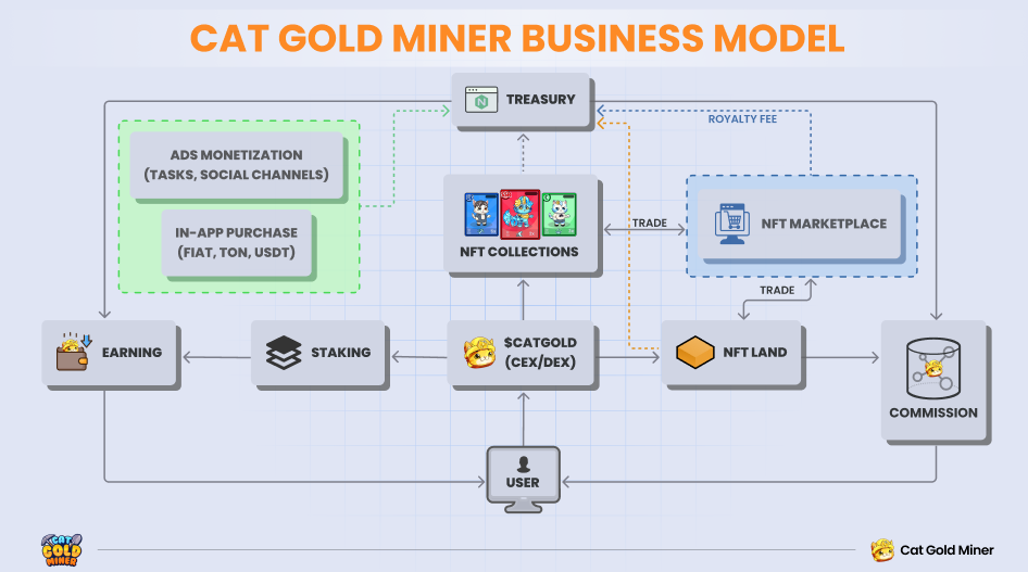 By playing the game and upgrading mines, players can collect $CATGM. The $CATGM rewards originate from: